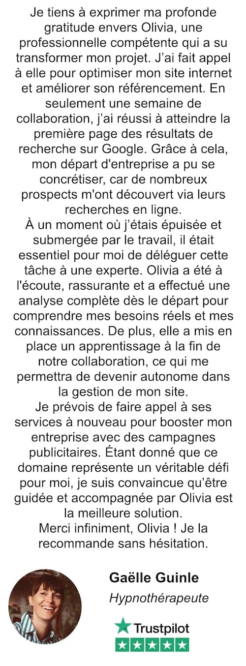 Gaëlle Guinle est hypnothérapeute et praticienne PNL à Marseille. Elle a créé elle-même son site, mais il ne ressortait nulle part. Elle a fait appel à mes services pour booster la visibilité de son activité pour remplir son carnet de rendez-vous.