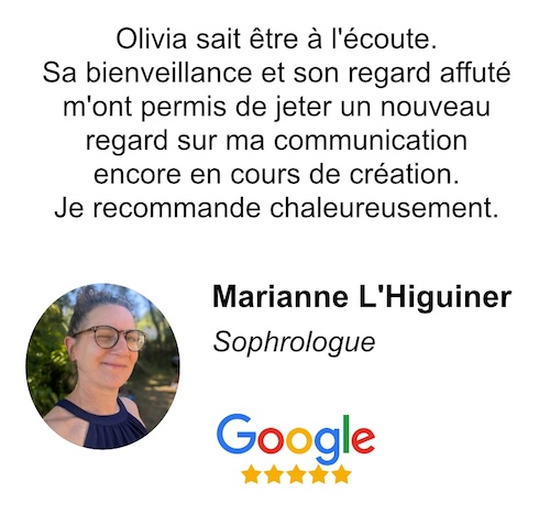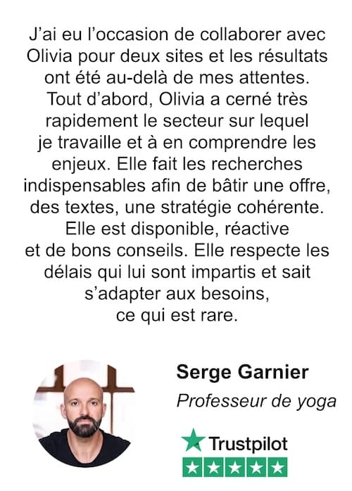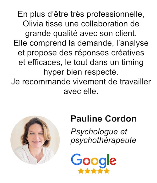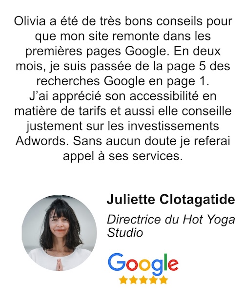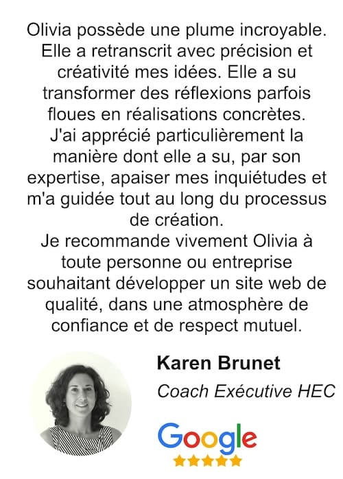 EXCELLENT Basée sur 4 avis Isabelle de Grandmaison14/02/2025Trustindex vérifie que la source originale de l'avis est Google. Je recommande vivement Olivia pour son professionnalisme et sa réactivité. Ce que j'apprécie le plus particulièrement, c'est sa capacité à traduire visuellement le "monde intérieur" de ses clients, ce qui fait leur singularité. Pour cela elle s'applique à bien en comprendre la spécificité et y arrive avec beaucoup de finesse ! Catherine Kesting04/09/2023Trustindex vérifie que la source originale de l'avis est Google. Olivia Sarini est une pépite dans l'univers de la création de sites. Elle est humaine, chaleureuse, à l'écoute, rigoureuse, toujours positive et énergique. Et puis, Olivia est ultra professionnelle. Elle connait les techniques, recherche les meilleures solutions, et sait créer un site clé en mains sur mesure. Sans compter son talent d'écriture qui est un plus indéniable pour se doter d'un site performant. Je recommande donc plus que chaleureusement ! Pauline Cordon07/06/2023Trustindex vérifie que la source originale de l'avis est Google. Une rédactrice hors pair pour un service réalisé avec le plus grand soin ! Son aide est vivement recommandée, de toute confiance. BIKRAM YOGA MARSEILLE01/06/2023Trustindex vérifie que la source originale de l'avis est Google. Olivia a été de tres bons conseils pour que mon site remonte dans les premieres pages Google. En 2 mois je suis passée de la page 5 des recherches Google en page 1. Aussi j'ai apprécié son accessibilité en matière de tarifs et aussi elle conseille justement sur les investissements adwords. Sans aucun doute Je referai appel à ses services